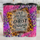 Este gráfico ousado apresenta a poderosa citação "EU POSSO FAZER Tudo através do CRISTO QUE me fortalece" de "FILIPIANOS 4:13". O texto é exibido de forma destacada em scripts pretos e fontes sans-serif brancas. Um fundo vibrante de impressão leopardo, contornos de fúcsia e matizes roxos cria uma design cristã enérgica e capacitante