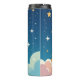 Cute red and white rocket blasting off in space with whimsical stars and clouds.