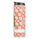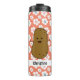 Adorável tumbler térmico com um bonitinho e feliz desenho de batata marrom. O fundo é um padrão floral fofo de flores margaridas brancas em cor rosa-salmão. Um modelo na parte inferior da batata para adicionar seu nome.