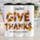 Este gráfico apresenta as palavras "GIVE OBRIGADOS" soletradas usando uma variedade de folhas de outono e bolotas em tons quentes de laranja, amarelo e marrom. Abaixo encontra-se a frase "Dar aos obrigados em todas as circunstâncias" e a referência bíblica "1 Salónica 5:18". A design tem uma estética desenhada à mão, com tema de queda.