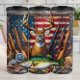 Essa imagem apresenta uma mostra impressionante de temas de caça e pesca contra um pano de fundo de bandeira americana e metida. Uma cabeça real de veado com proeminentes galhadas está centrada, enquanto um grande e vibrante baixo está no fundo. Várias espingardas e artes de pesca, incluindo as linhas e os carretéis, estão meticulosamente dispostas em torno das figuras centrais, todas colocadas contra uma parede russa de madeira.