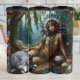 Uma serena Nativa Americana, adornada em uma morada e joia turquesa, descansa pacificamente contra rochas em um anzol de floresta coberto de sol. Uma grande loba cinza está enrolada de forma protetora ao seu lado, ambas aparentemente dormindo. Esmague o verde, um vislumbre de uma floresta além, e uma suave filtragem de luz através da cobertura cria uma cena tranquila e sonhadora.
