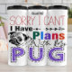 Este gráfico caprichoso declara, "DESCULPE, NÃO POSSO... Planos com meu PUG" em uma fonte divertida e angustiada. Um belo cãozinho preto-e-branco com uma expressão doce é destacado junto ao texto. A design é perfeita para amantes de cães, incorporando uma desculpa leve para priorizar o tempo com um amado companheiro canino.