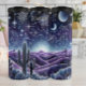 Esta ilustração encantadora mostra uma paisagem serena do deserto sob um céu noturno que respira. Os cactos de saguaro silenciados são colocados contra a rolagem de dunas roxas, iluminadas por uma luz brilhante e ascensão no horizonte. Acima, uma lua de cheio detalhada, lua crescente, inúmeras estrelas e constelações criam um panorama celeste mágico.