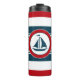 Design náutica com decoração em forma redonda de embarcações à vela, em fundo listrado, a azul, vermelho e branco