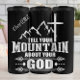 Esta é uma design gráfica com uma frase espiritual em uma fonte branca estilizada e angustiada. O texto é colocado sobre um fundo simples e leve de cinzas. A frase diz, "CONTE À SUA MONTANHA SOBRE SEU DEUS", e é acompanhada por um contorno estilizado de uma cordilheira e uma cruz. A design também inclui flechas decorativas e forma de diamante. A estética global é poderosa e minimalista, adequada para uma variedade de produtos inspiradores.
