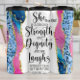Este gráfico elegante apresenta a escritura empoderadora "Ela está vestida em força e dignidade e ri SEM MEDO DO FUTURO" de "PROVERBS 31:25". O script preto e o texto sans-serif são colocados contra um fundo abstrato impressionante de cor-de-rosa vibrante, azul profundo e brilho dourado. Este design encarna maravilhosamente a fé e a resiliência.