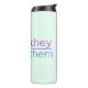 Rótulo pronoun com torção divertida: fundo da casa da moeda com texto variado de cor pastel. Adicione seu nome a este tumbler térmico também! Excelente para pessoas trans, enby, fluido de gênero ou não conformes. Divirta-se em declarar seus pronomes enquanto obtém as vantagens desta linda caneca.