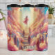 Essa imagem etérea representa uma figura em vestes fluentes, subindo uma escada longa que leva para cima através de nuvens fofinhas e cor-de-rosa. Numerosas cruzes estão entre as nuvens de ambos os lados da escada, e outras figuras em vestes também estão presentes, olhando para uma luz radiante emanando de cima.