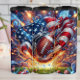 Um futebol americano dinâmico rebenta de um estádio no meio de um turbilhão de estrelas e listras e fogos de artifício explodindo. A bandeira americana se desenrola dramaticamente ao fundo, enquanto confetti e fitas patrióticas giram em torno do futebol central e do capacete, criando uma cena esportiva de alta energia, celebratória e distintamente americana.