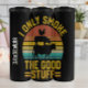 Este gráfico apresenta um design humorístico com uma silhueta de vaca, porco e galinha empilhada contra um pôr do sol retrorado listrado. O texto "EU SOMENTE FUMO AS BOAS COISAS" está em uma fonte ousada e angustiada, criando um gráfico simples e espirituoso perfeito para um entusiasta de churrasco ou mestre de churrasco.