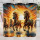 A group of five majestic horses with vibrant, fiery manes thunder through shimmering water, creating dramatic splashes. The scene is bathed in the intense, golden glow of a setting sun against a vivid orange and yellow sky, evoking raw power and untamed beauty.