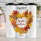 Este gráfico apresenta uma coroa coronária feita de folhas e pinecones vibrantes do outono. O texto "Estar quieto e saber" está escrito em uma escrita vermelha fluente no centro, com "Salm 46:10" no fundo, criando uma mensagem religiosa serena e inspiradora.