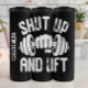 Este gráfico arrojado mostra uma mão segurando uma campainha em um estilo vintage, angustiado. O design inclui o texto direto e motivacional 'SHUT UP AND LIFT', criando uma peça de declaração sem disparates para qualquer pessoa focada em seus objetivos de malhação
