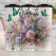 Esta é uma bela e detalhada ilustração de um buquê grande e exuberante de flores em cores pastel macio, incluindo rosas rosa, flores roxas e azuis, e ranhuras de lavanda. O buquê está amarrado com uma delicada fita rosa e rodeado por borboletas azuis e verdes vibrantes. A palavra "Forever" é graciosamente escrita em uma fonte de script na parte inferior do design. A imagem inteira tem uma estética suave, serena e romântica.
