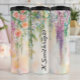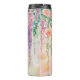Esta bela pintura aquosa apresenta uma cascata de flores penduradas, incluindo rosas e asterias laranja e rosa macios. A folhagem verde-luxuosa e as delicadas florações são feitas num estilo solto e fluido contra um fundo sereno de matizes amarelas, laranja e cor-de-rosa, criando uma ilustração botânica leve e pacífica.