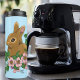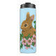 Um coelho marrom giro se senta entre flores cor-de-rosa em um pano de fundo da rosa claro