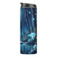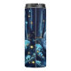 Esta é uma ilustração mística e etérea de um tigre branco descansando em uma floresta mágica à noite. O tigre, com seus olhos azuis flagrantes, está deitado por um corpo de água tranquilo, com sua reflexão visível abaixo. A floresta é composta por árvores altas, escuras e bobas, iluminadas por uma grande lua de cheio e luzes semelhantes a vaga-lume. Cogumelos azuis e brancos brilhantes brotam do chão, adicionando à atmosfera mágica.