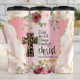 Esse gráfico espiritual mostra a afirmação "Eu posso fazer tudo através do Cristo que me fortalece". Uma proeminente cruz-leopardo fica à esquerda, simbolizando a ousadia. O design é colocado contra um fundo de aquarela cor-de-rosa macia com sotaques de brilho ouro e enfeitado com delicados rosas cor-de-rosa e marrom e verde, transmitindo força feminina e fé.