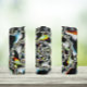 Este lindo tumbler térmico apresenta uma arte fractal espiral abstrato, psicodélica em preto e branco com sotaques amarelos, laranja, azuis e verdes. Imagem de fundo do site rawpixel.com no Freepik.