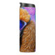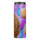 Cão-de-rabo-preto vestindo um par de óculos de sol que apanham os olhos com um design único que apresenta um caleidoscópio de matizes cor-de-rosa, azul, roxo e laranja.