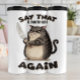 Este gráfico peculiar apresenta um gato gordinho e zangado segurando uma faca grande. A design intimidante e humorística é completada com o texto 'DIGA ISSO NOVAMENTE', criando uma reportagem engraçada e sarcástica.