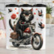 Esta imagem humorística mostra um gato preto rabugento vestindo uma jaqueta de couro e montando uma moto vermelha. O gato segura uma rosa vermelha solteiro com a cauda. A cena é cheia de um divertido contraste de imagens fortes de motociclistas e elementos românticos como corações flutuantes e pássaros zangados, criando uma paródia engraçada e sarcástica de uma viagem temática amorosa.