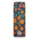 Gato de arte popular laranja e azul com olhos azuis e uma arte ai floral.