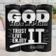 This inspiring black and white design proclaims "GOD Has A Plan TRUST LIVE ENJOY IT." "GOD" is bold and outlined, while "Has A Plan" is italicized. "TRUST LIVE ENJOY IT" is presented with strong, impactful typography, emphasizing the importance of faith and living fully in God's will.