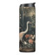pintura botânica vintage de guindastes em pé num lago cercado por lindas flores exóticas com palácio ao fundo