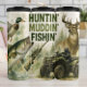 Esta imagem celebra atividades ao ar livre com uma colagem que apresenta um pato-grande em voo, um grande robalo saltando da água e um veado com galhadas observando de uma floresta de pinheiros. No primeiro plano, uma pessoa num ATV tem uma espingarda, simbolizando várias perseguições de caça, de fora da linha e de pesca. O texto "HUNTIN' MUDDIN' FISHIN'" aparece de forma destacada acima, unificando o tema ao ar livre.
