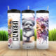 Um filhote maltês liso, com uma expressão feliz e aberta, salta dramaticamente em meio a uma variedade vibrante de girassóis, rosas cor-de-rosa e flores silvestres roxas. A composição artística captura o espírito alegre e encantador da raça num ambiente floral vivo.
