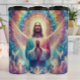 Essa imagem etérea retrata uma figura com asas grandes e radiantes e uma túnica com gradiente colorido. As mãos dele estão amarradas em oração. Ele tem um halo brilhante, e o fundo é um mosaico caleidoscópico, girando de luz e figuras pequenas aladas, criando uma visão surreal e espiritual.