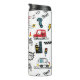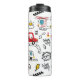 A playful, cartoon-style city pattern featuring buses, cars, helicopters, traffic lights, buildings, and fun doodle text like “Beep Beep,” “Wuz Up?” and “Go,” in bright red, yellow, blue, and black tones.