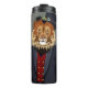 Este retrato das características de design de um leão no terno e no chapéu de negócio de um homem.