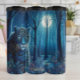Essa ilustração encantadora retrata um leopardo de tom azul com olhos azuis brilhantes, parcialmente ocultado no mato de uma floresta mágica à noite. Uma grande e brilhante lua de cheio ilumina a cena através dos ramos nuos de árvores altas, lançando longas sombras e destacando os intrincados detalhes da floresta e da pelagem padronizada do leopardo. A paleta de cores é predominantemente tons de azul, criando uma atmosfera serena e mística.