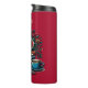 Tumbler personalizado com livros antigos, flores antigas e uma pilha de livros nostálgicos ao lado de uma xícara de café quente. Cores em branco, azul, vermelho e branco.