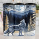 Um lobo branco solitário, majestoso com pelúcia espessa se posiciona em uma paisagem intocada de neve, sua cabeça se inclinou para trás em uma poderosa uivela em direção a uma lua de cheio maciça e radiante no céu noturno. Os pinheiros altos e escuros e as montanhas distantes são silenciados contra o brilho da lua, com árvores mais leves e poeirentas no primeiro plano, criando uma cena serena e mística de inverno.