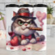 Esta imagem humorística apresenta um gato rabugento com olhos verdes, vestindo um chapéu de fedora e uma gravata vermelha, e fumando um charuto. Um copo de vinho, um travesseiro em forma de coração, e uma carta de amor são colocados por perto. Uma lufada de fumaça em forma de coração adiciona ao engraçado contraste entre o forte olhar de mafioso e os elementos românticos, criando uma cena de Dia de os namorados sarcástico.