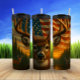 Uma grande arca com proeminentes galhadas fica em frente e no centro, seu olhar direto. Atrás dele, uma vibrante bandeira americana se estende através do céu, banhada no brilho quente de um pôr do sol sobre uma paisagem florestal com um corpo calmo de água. Os cervos mais pequenos são visíveis à distância, melhorando a sensação de uma grande paisagem selvagem imbuída de simbolismo patriótico.