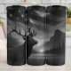 Esta trabalho de arte monocromática apresenta um alce majestoso com grandes galhadas silenciadas contra uma paisagem dramática de montanha. Ao fundo, uma grande bandeira americana é parcialmente visível, sutilmente integrada no céu sobre um lago sereno e uma linha de pinheiros. O sol, ou lua, aparece no horizonte, lançando um brilho suave. Toda a cena é feita em tons de preto, branco e cinza, enfatizando a beleza robusta da natureza selvagem e a bandeira simbólica.