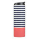 Tumbler térmico personalizado do na moda em cores coral, azul-marinho e branco. Este design apresenta um marinho clássico pré-disquete e um padrão listrado branco. Personalize-o com seu nome monograma ou outro texto personalizado com um símbolo cardíaco fofo. Use as ferramentas de design para escolher qualquer cor de fundo, editar as fontes de texto e as cores e carregar suas próprias fotos para criar uma única de uma garrafa de água com monograma.