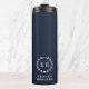 Marinho na moda Blue Name Monogrammed Laurel Wreath Thermal Tumbler - A elegante coroa branca laurel apresenta uma forma cardíaca no meio. Personalize as garrafas de água mais pequenas com sua primeira e sobrenome letra inicial. Para mais personalização, adicione o nome do seu cheio ao nome modelo. Uma ideia elegante e ponderada de presente para Dia de os namorados, aniversário, Dia de as mães, aposentadoria, graduação, etc.