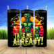 Uma ilustração dinâmica e vibrante apresenta dois aliens de pele verde, um grande e um pequeno, posicionados contra um pôr do sol laranja e listrado amarelo. Vários discos voadores com feixes brilhantes descem de cima. O texto proeminente "LEVE-ME JÁ!" acrescenta um apelo humorístico e extraterrestre.