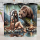 Esta imagem representa uma cena serena por um corpo de água calmo, refletindo a folhagem circundante. Uma jovem de cabelo escuro comprido e ondulante, adornada em roupas inspiradas no indígenas e uma morada de penas impressionante, senta-se descalça sobre pedras lisas perto de uma fogueira de estalo. Um grande urso pardo levemente repousa sua cabeça num tronco caído atrás dela, olhando para baixo para a mulher. As cestas e as lanças inclinam-se contra uma árvore nas proximidades, somando-se à atmosfera pacífica da zona aquática.