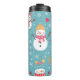 A imagem é um padrão alegre no tema do Natal em um fundo azul claro. Ele apresenta vários adoráveis bonitos bonecos de neve com diferentes chapéus e cachecóis coloridos, intercalados com flocos de neve, corações, estrelas e presentes envoltos. A estética geral é lúdica e festiva, evocando o espírito da época de férias.