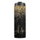 Tumbler Térmico do Monograma Elegante com Glitter Dourado. Personalize facilmente este design de humor térmico modesto com elegante brilho dourado em fundo preto. O design apresenta seu monograma manuscrito com toalhetes bonito e nome.