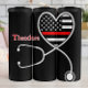 This graphic combines medical and emergency service themes into a single design. A stylized stethoscope forms the shape of a heart that is filled with a black, white, and Thin Red Line pattern, resembling a distressed American flag. This imagery is often used to represent Nurses or EMS/Paramedics who support or work with firefighters. The design is set against a black background and includes the customizable name "Theodore" on the side.