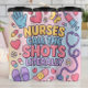 A cheerful, cartoon-style design features the phrase "NURSES CALL THE SHOTS LITERALLY" in bold, colorful letters, celebrating the nursing profession. Surrounding the text are whimsical illustrations of medical items like gloves, hearts, butterflies, syringes, pills, a stethoscope, and bandages, all in soft pastel hues. "K.Smithright" is subtly integrated, making it a personalized and lighthearted tribute. Replace the name with your name