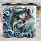 Esta é uma ilustração dinâmica e enérgica de um grande peixe-base saltando de um turbulento oceano azul. O peixe, com a boca aberta, está prestes a morder uma isca de prata e verde. A cena é dominada por ondas dramáticas e giratórias do oceano e espuma branca, criando uma sensação de poderoso movimento.
